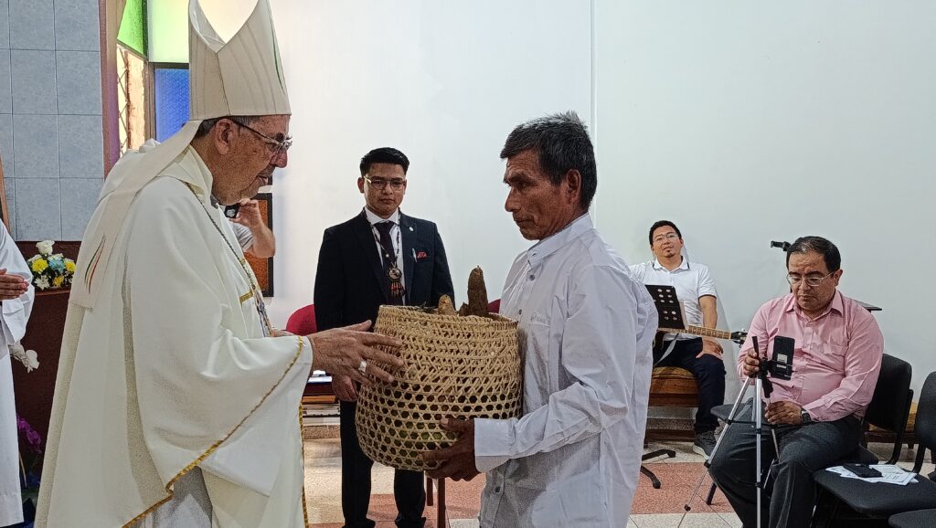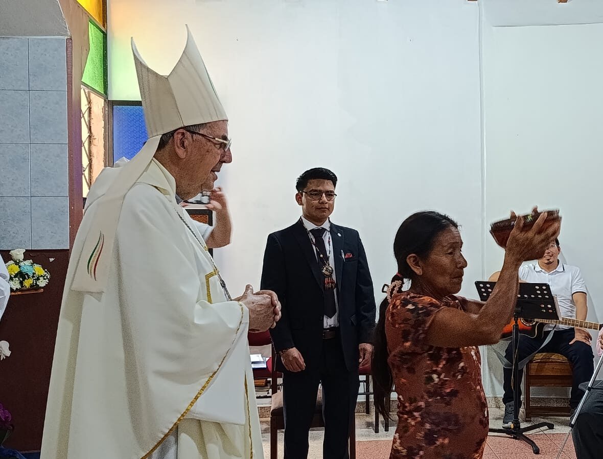 En el ofertorio, junto con el pan y el vino, su madre ofreció una mokawa, una vasija de barro muy especial hecho por las mujeres de la Amazonía y su padre: una ashanga, una canasta fuerte llena de frutas frescas de la selva: plátanos, yuca y otros regalos de la tierra; “Esta canasta es una señal de que somos agradecidos por la comida y por el esfuerzo de quienes cultivan sin dañar el bosque” se dijo en la monición de ofendas.